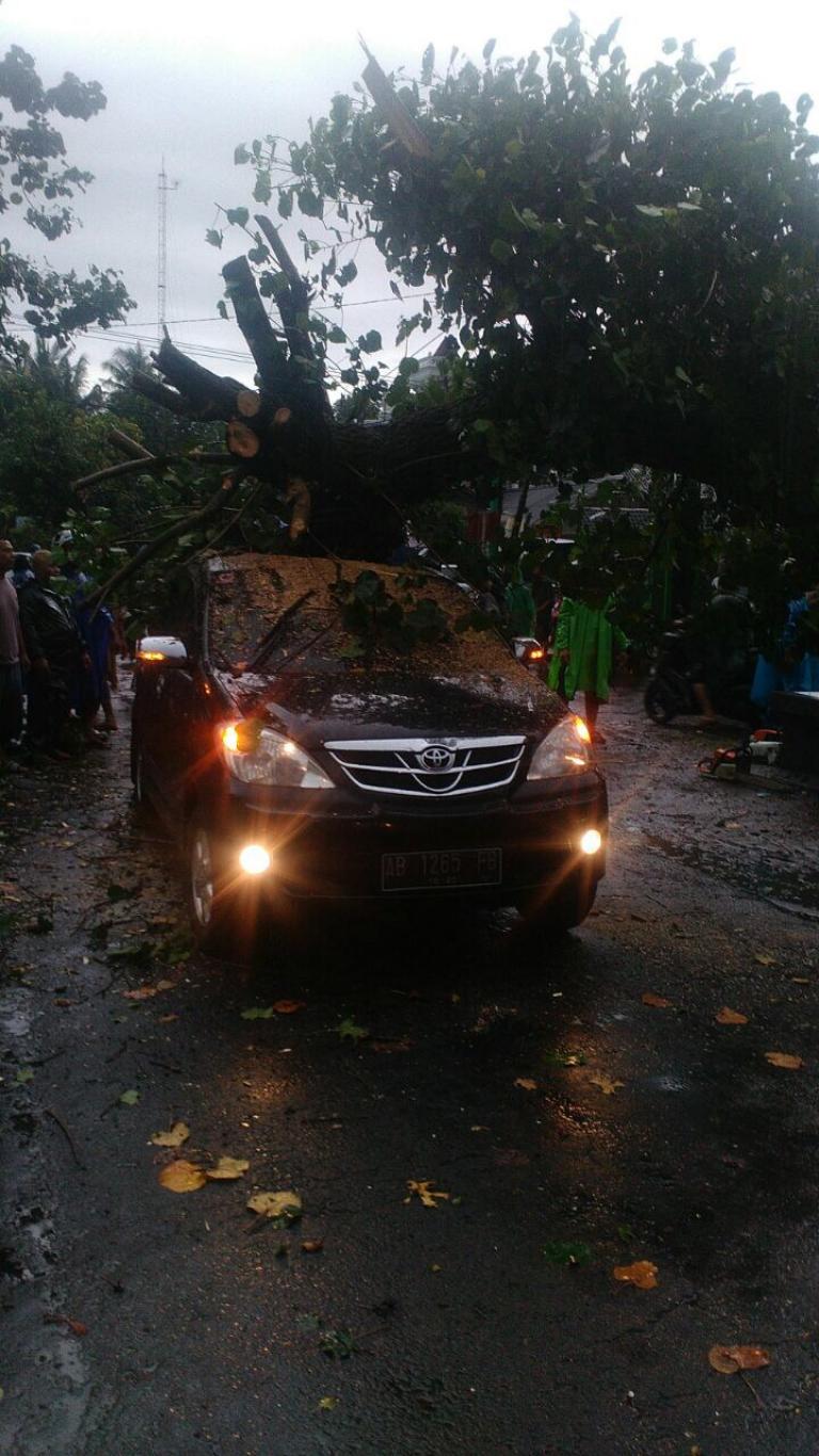 Pohon tersebut menimpa sebuah mobil Avanza dengan Nopol AB 1265 FB yang sedang melintas di jalan. Bagian atas mobil ringsek akibat hantaman pohon yang lumayan besar.