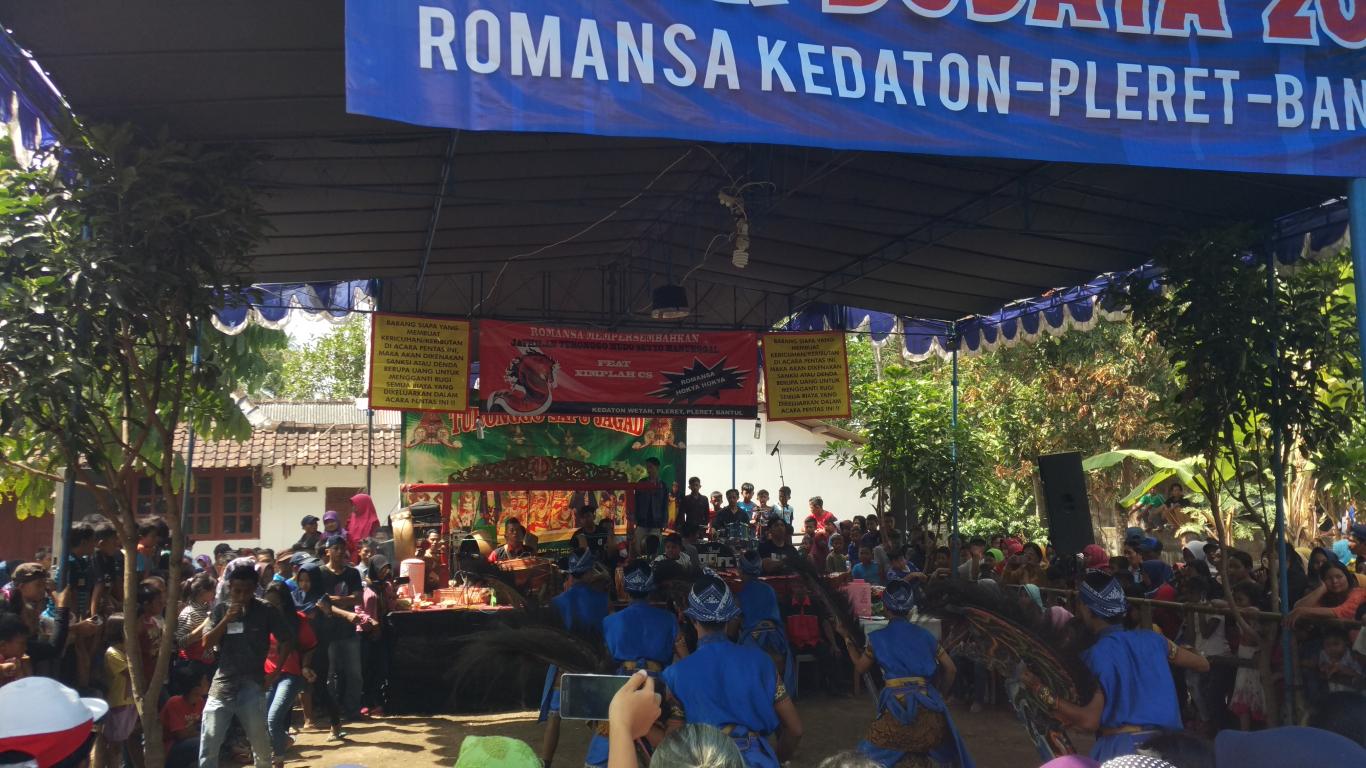 infoPleret- Rombongan Ronda Malam Selasa (ROMANSA) bekerjasama dengan pemuda-pemudi IKARTAKA mengadakan pentas kesenian yang bertempat di lahan kosong wilayah Kedaton RT 006 pada hari Minggu, 2 September 2018. Acara ini dimulai pukul 13.00 WIB sampai dengan tengah malam. Pentas jathilan kali ini dari Turonggo Mudho Setyo Manunggal dari Pelem Lor yang berkolaborasi dengan Turonggo Mudho Sapu Jagad dari Demangan, Jambidan dan Ximplah CS. Mereka menampilkan pentas dengan 4 babak, yang juga dimeriahkan oleh atraksi barongan Kediri. Selama acara berlangsung dijaga oleh pihak kepolisian Polsek Pleret. Acara berlangsung aman, tertib, dan meriah.