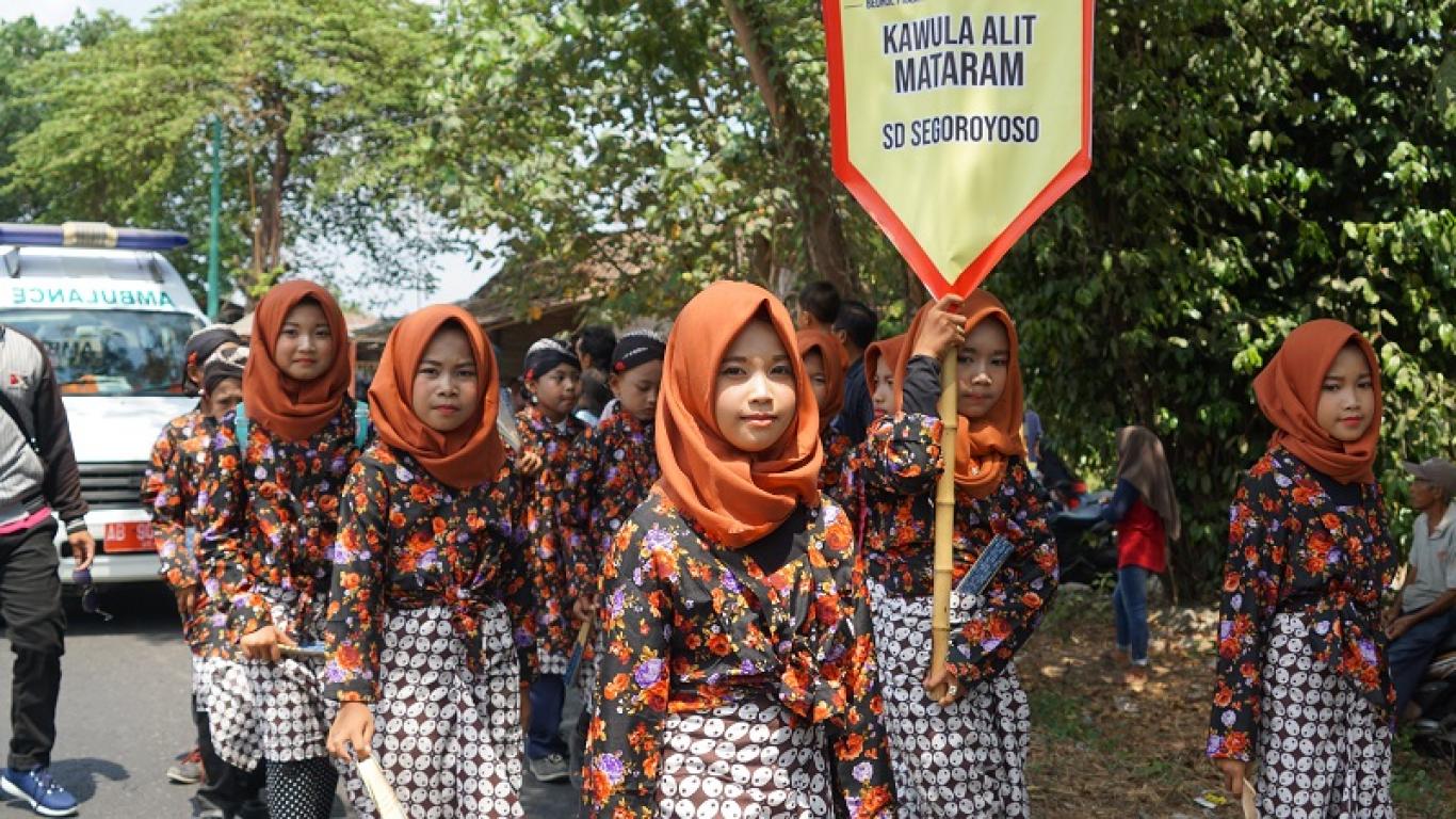 infoPleret- Ratusan masyarakat di Kecamatan Pleret ikut serta berpartisipasi dalam memeriahkan acara Kirab Budaya Mataram pada Minggu (27/10) yang diselenggarakan oleh Yayasan Warisan Budaya Mataram (YWBM). Peserta Kirab yang terdiri dari tingkat SD hingga tingkat SMA, perwakilan dari masing-masing pedukuhan, beserta Pamong Kalurahan Pleret, dan Kecamatan Pleret. Peserta terdiri dari SD Kanggotan, SD NU Pemanahan, SD Bawuran, SD Dahromo, SD Segoroyoso, SMP 3 Pleret, SMP 1 Jejeran, Mts 6 Bantul, MA Al-Mahalli Brajan,Mts. Al-Mahalli, MAN 3 Bantul. Tampak wajah penuh keceriaan dimasing-masing peserta kirab, walau terik matahari menyengat tetapi peserta tetap bersemangat berjalan kaki yang kurang lebih 1km jaraknya. Start di Balai Desa Pleret berjalan ke Timur sampai perempatan Kantor Pos Pleret ke Utara lalu sampai pertigaan Kecamatan ke Barat lalu finish di Lapangan Sultan Agung. (rga)