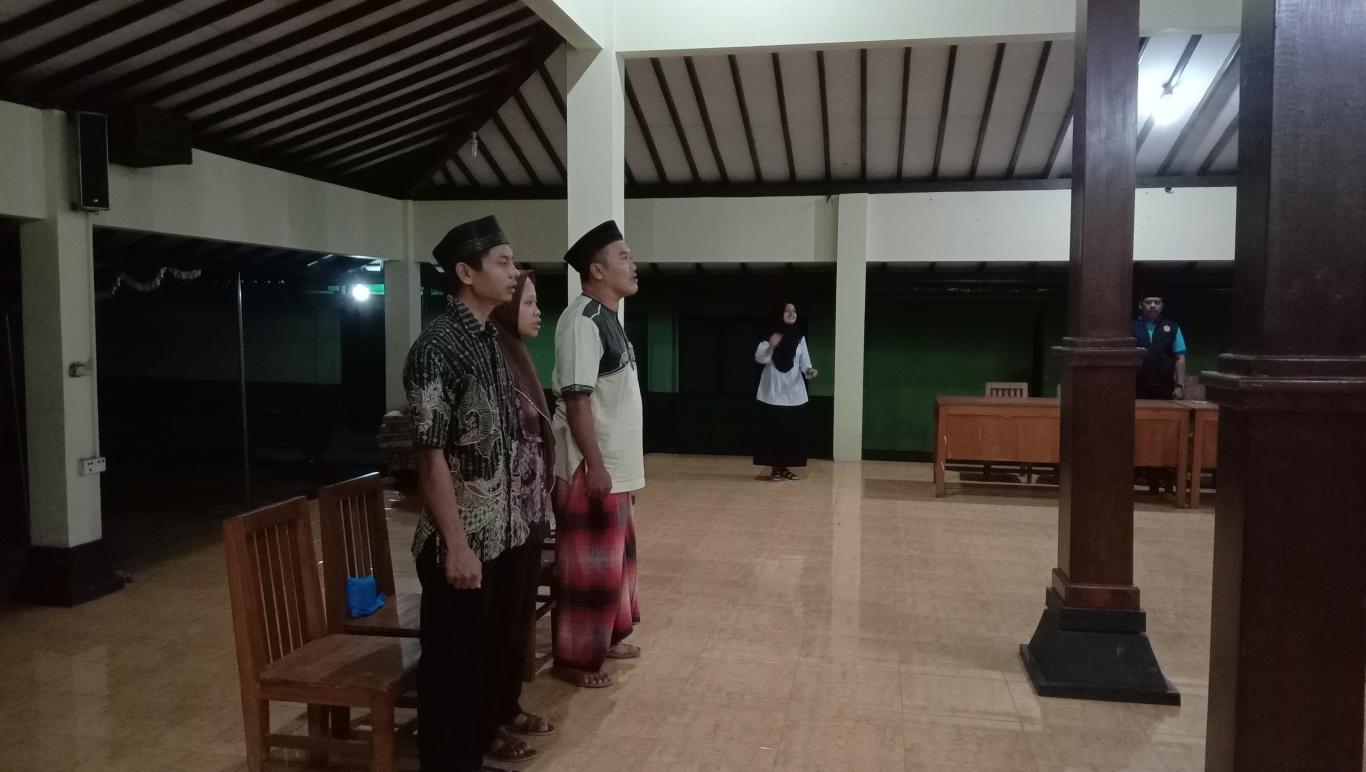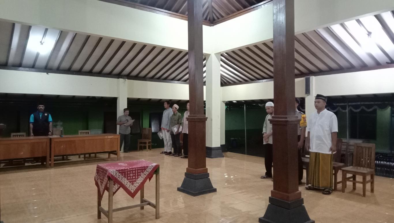 infoPleret- Calon Dukuh Gunungan yang terpilih, Suprihatin, pada hari Rabu, 03 April 2019 pukul 20.00 WIB mengikuti prosesi gladi bersih untuk pelantikan besok yang dilaksanakan di Pendopo Balai Desa Pleret. Hadir dalam kesempatan tersebut, Kasi Tapem Kecamatan Pleret, Bhabinkamtibmas Desa Pleret, BPD Desa Pleret, serta Pamong Desa Pleret.