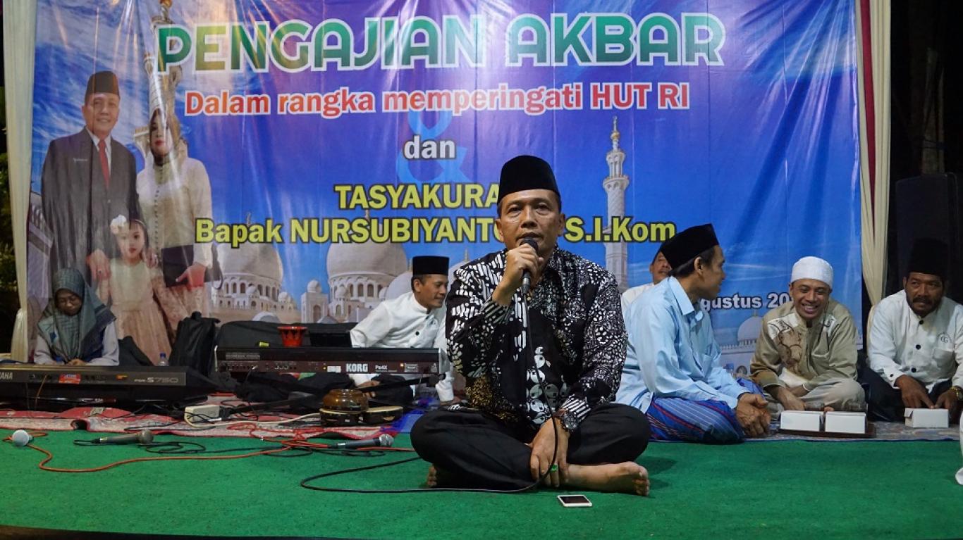 infoPleret- Bertempat di Halaman Rumah Nur Subiyantoro, S.I.Kom Ketua Dewan Perwakilan Rakyat Daerah Kabupaten Bantul menggelar acara pengajian akbar dan tasyakuran yang diikuti seluruh warga Kanggotan dan sekitarnya. Acara tersebut diselenggarakan oleh panitia yang dipimpin oleh Agus Sulitriyanto, dan dilanjutkan dengan hiburan Gambus dari Pucung Imogiri. Nur Subiyantoro S.I.Kom dalam sambutannya menyampaikan rasa terima kasih yang sedalam dalamnya kepada seluruh warga masyarakat yang telah memberikan dukungannya pada saat pemilu dan menjabat Wakil DPRD Bantul hingga saat ini sampai dengan 5 (lima) tahun kedepan dan meminta doa agar jabatan yang diperoleh benar-benar amanah. (jz12gws)