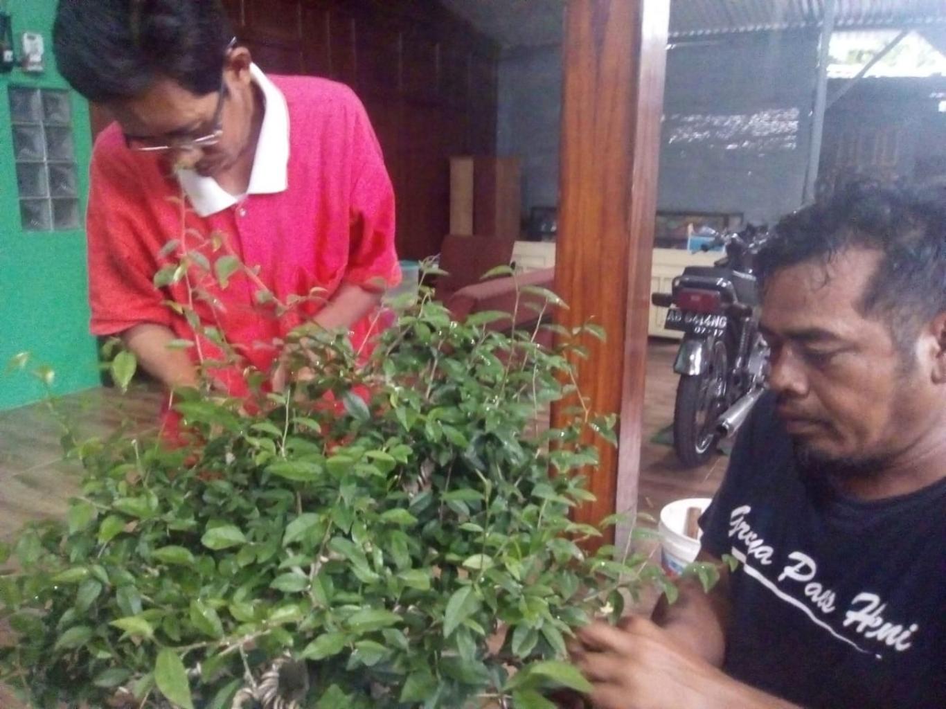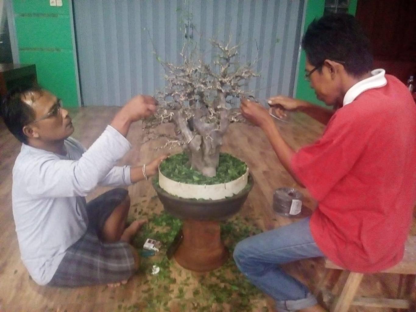 infoPleret- Minggu, tanggal 02 Februari 2020 anggota taruna tani Desa Pleret (Eko Sapto/Eko Pleret) bersama anggota komunitas bonsai Jogja melakukan perawatan bonsai koleksi seorang bonsai di Dusun Kloron Segoroyoso. Dengan penuh kehati-hatian Eko Pleret bersama rekan melakukan pruning (menghilangkan daun) tanaman streblues atau serut lanang. Setelah semua daun habis barulah dilakukan penyeleksian ranting agar tanaman tampak lebih indah dan enak di lihat. Barulah tahap terakhir di lakukan pelepasan kawat yang di gunakan untuk mengarahkan cabang dan ranting, agar pertumbuhan tanaman bisa lebih sehat dan kesan alami terlihat. (CM-136 /EP)
