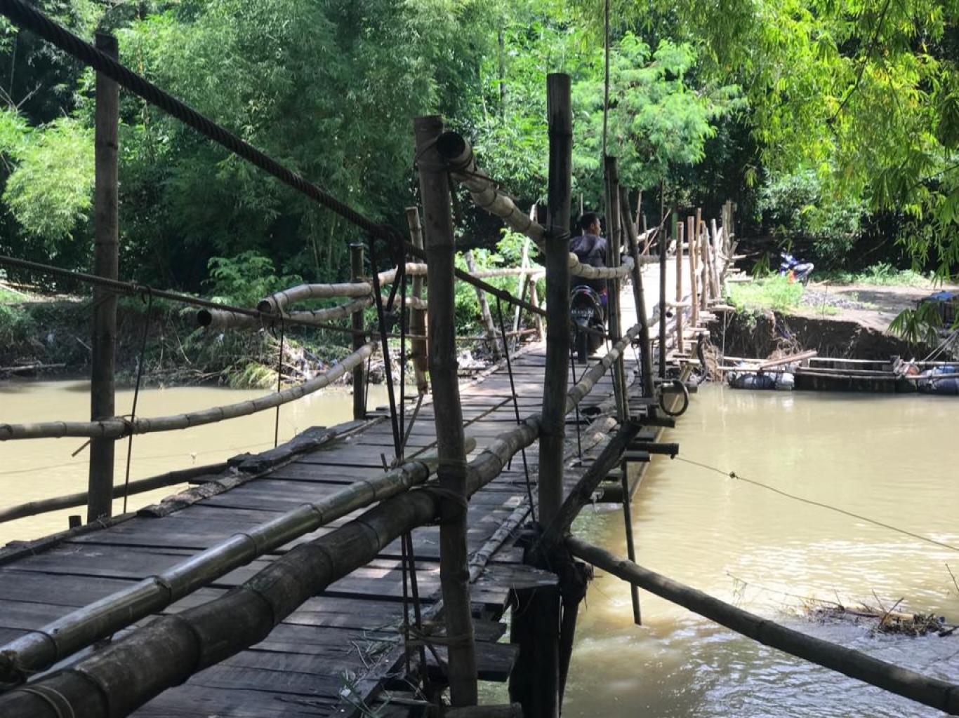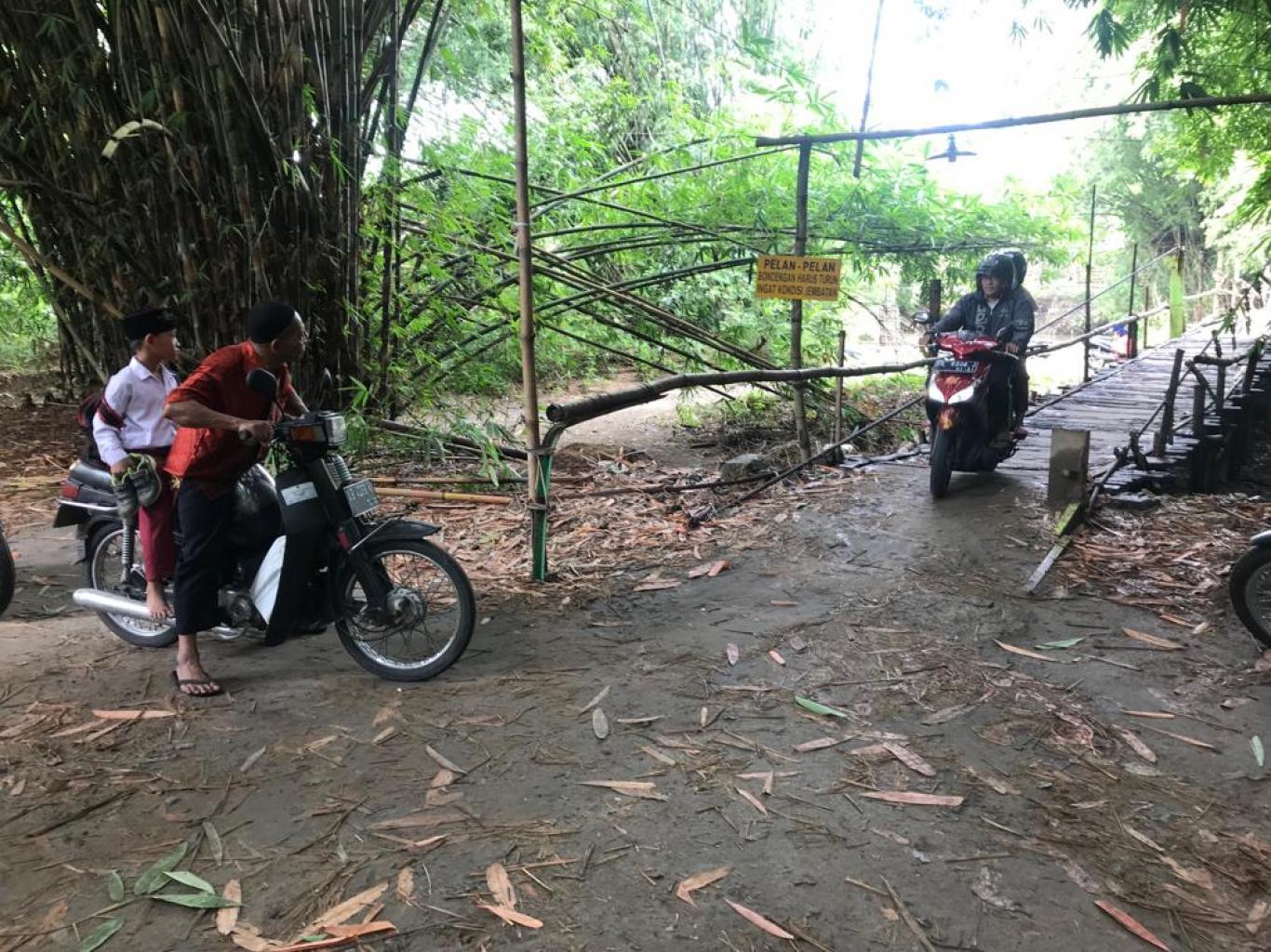 infoPleret- Selasa 10/3, Jembatan Gantung yang menghubungkan antara desa Karet dan Karanggayam segoroyoso pleret bantul terlihat sangat memprihatinkan. Jembatan yang dibangun warga setempat ini bertujuan sebagai ganti sementara dari jembatan yang telah hancur di terjang banjir besar beberapa tahun lalu. Melihat kondisi jembatan yang sangat berbahaya untuk dilintasi, dan rawan. Warga satu per satu bergantian menyebrangi jembatan gantung tersebut. Jembatan gantung bergoyang ketika dilalui kendaraan seperti sepeda motor, maka dari itu warga diharapkan sangat berhati-hati ketika melalui jembatan tersebut. Disana telah dituliskan papan peringatan “PELAN-PELAN BONCENGAN HARUS TURUN INGAT KONDISI JEMBATAN” peringatan itu dimaksudkan agar warga yang hendak melalui jembatan tersebut haruslah mengingat kondisi jembatan yang rentan dan berbahaya. Meskipun berbahaya jembatan tersebut adalah salah satu penghubung dan jalan pintas tercepat yang bisa di lalui warga jika ingin ke desa seberang, karena jika warga harus memutar maka harus menempuh jarak yang begitu jauh. Jembatan ini sudah berdiri kurang lebih tiga tahun lamanya, dan sudah pernah beberapakali mengalami kerusakan akibat faktor alam. Bapak Musuro warga Karanggayam yang sempat kami wawancarai ketika berjaga di jembatan tersebut mengatakan “ mengapa jembatan ini bergoyang.? Itu karena pada saat musim penghujan seperti sekarang di bagian tengah jembatan tidak di pasang tiang penyanggah, karena mengingat arus air yang deras ketika musim penghujan, dan berbahaya bagi kondisi jembatan sendiri dan biasanya ketika musim hujan berlalu mulailah dipasang tiang penyanggah di tengah jembatan sebagai penopang agar jembatan tak menimbulkan goyangan yang berbahaya bagi warga yang melintas”. Harapan warga dan pengguna jembatan lainnya supaya jembatan yang baru segera dapat dibangun, dan aman untuk dilewati, juga tidak menimbulkan goyangan pastinya. CM-100 RUDIANTO