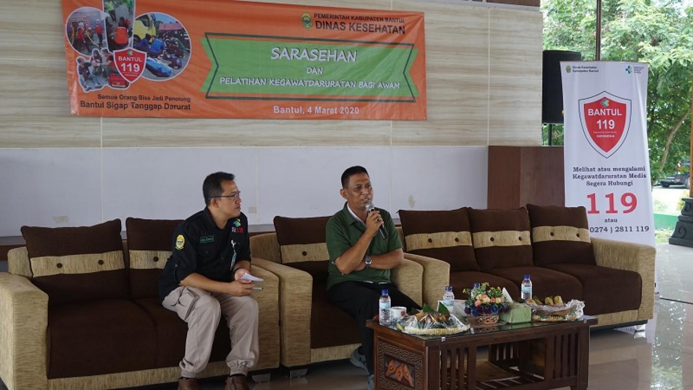 infoPleret- Sarasehan dan Pelatihan Kegawatdaruratan Bagi Awan. Rabu, 04/03 bertempat di Mandalasaba II Pemda II Pusat perkantoran Kabupaten Bantul Dinas Kesehatan menggandeng BPBD dan Instansi lainnya untuk memberikan pelatihan pada masyarakat melalui perwakilan dari 75 desa yang ada di Kabupaten Bantul. Acara dibuka langsung oleh Bupati Bantul Drs. Suharsono, dan dilanjutkan dari BPBD diwakili oleh bapak Teguh kemudian untuk praktik penyelamatan saat darurat oleh TIM kegawatdaruratan dari Dinas Kesehatan dibantu personil PMI Cabang Bantul. Sampai acara berakhir setelah diberikan waktu untuk tanya jawab mengenai Pertolongan Pertama Pada Kegawatdaruratan dengan harapan apabila diwilayah Bantul terjadi Bencana warga dapat bertindak untuk memberikan Pertolongan. CM-012/ Waluyo
