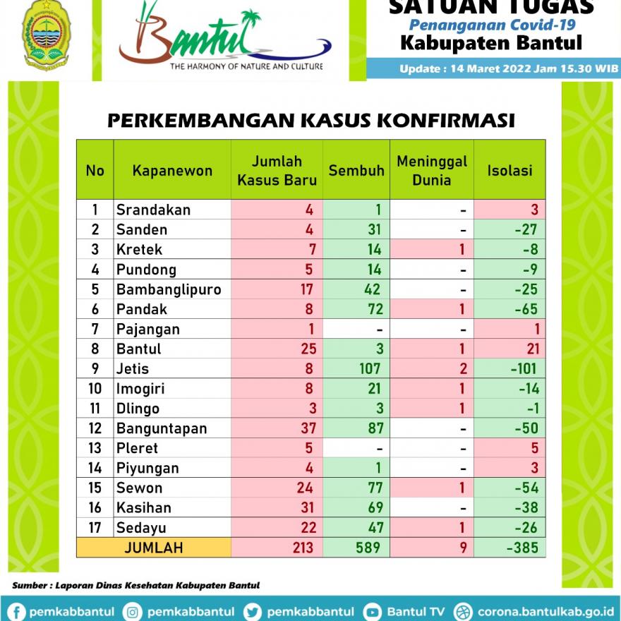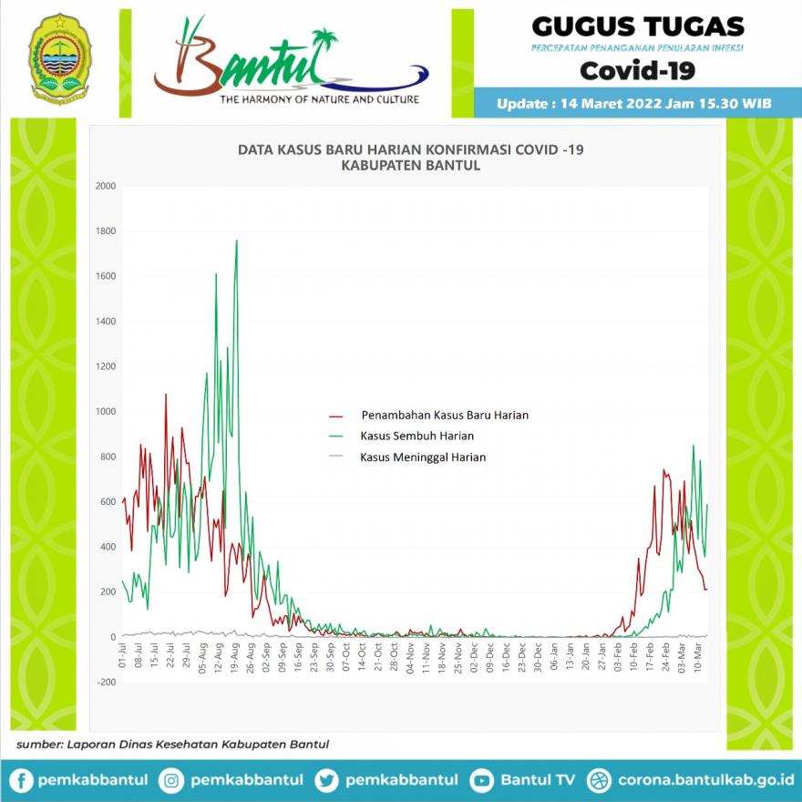 InfoCovid19 - Update data sebaran kasus Covid-19 di Kabupaten Bantul, berdasarkan data dari Dinas Kesehatan Kabupaten Bantul per Senin (14/3/2022) pukul 15.30 WIB, dengan data-data sebagai berikut :