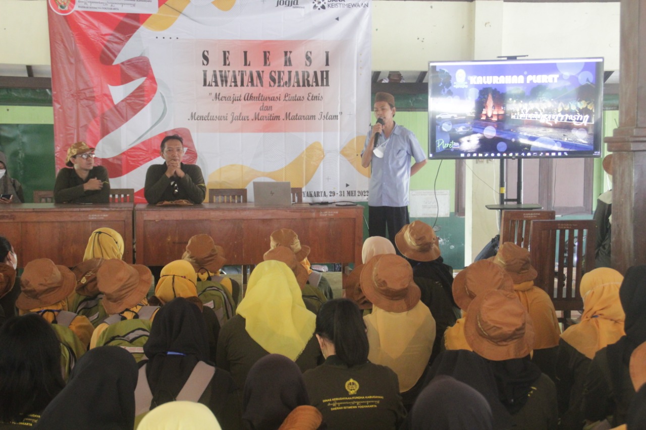 InfoPleret - Selasa, 31 Mei 2022 Desa Wisata Bumi Mataram Pleret turut mendampingi acara Seleksi Lawatan Sejarah yang dilaksanakan oleh Kundha Kabudayan Daerah Istimewa Yogyakarta pada hari Selasa 31 Mei 2022. Acara ini diikuti perwakilan siswa siswi SMA se-DIY. Diawali sambutan Lurah dan Disbud di Pendopo Kalurahan Pleret, siswa siswi yang telah dibagi kelompoknya ini kemudian mulai menyusuri jejak-jejak situs Pleret. Situs yang akan mereka kunjungi dibagi menjadi 5 pos. Pos pertama berada di Situs Kerto, Pos kedua Museum Purbakala, Pos ketiga Benteng Mataram atau Situs Kedaton, Pos keempat Makam Ratu malang dan pos terakhir adalah Masjid Kauman.