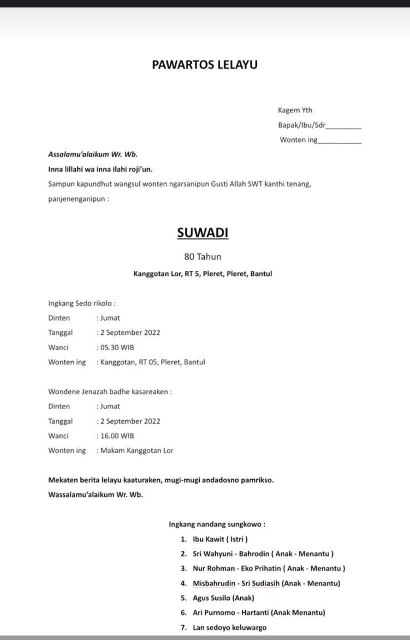 infoPleret - Lurah Pleret, Pamong bersama staf Kalurahan Pleret takziah di rumah duka Alm. Bapak Suwadi yang meninggal dunia pada hari Jum'at tanggal 2 September 2022 pk.05.30 di Rumah Duka Kanggotan RT 05 Pleret Bantul, beliau dimakamkan hari ini Jum'at, 2 September 2022 pk.16.00 di makam muslim Kanggotan lor pleret pleret Bantul.