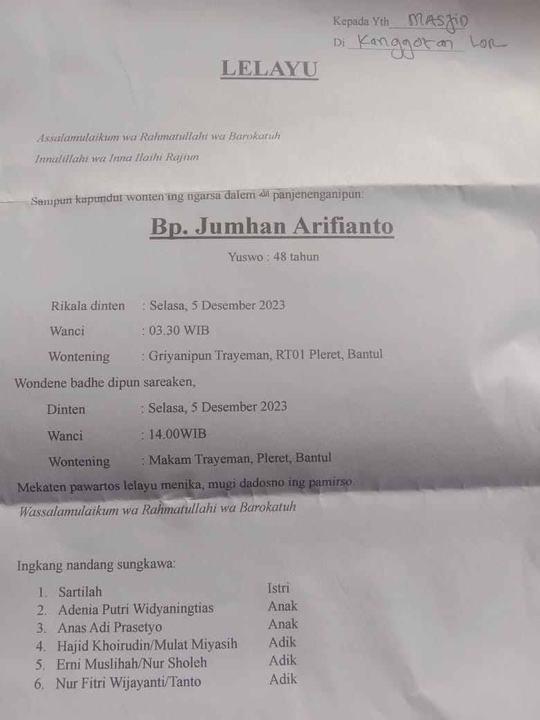 Semoga Allah SWT menerima amal ibadahnya, mengampuni segala dosanya, dan menjadikan tempat peristirahatan terakhirnya di makam Trayeman Pleret sebagai taman surgawi. Semoga keluarga yang ditinggalkan diberikan ketabahan dan kekuatan dalam menghadapi cobaan ini.