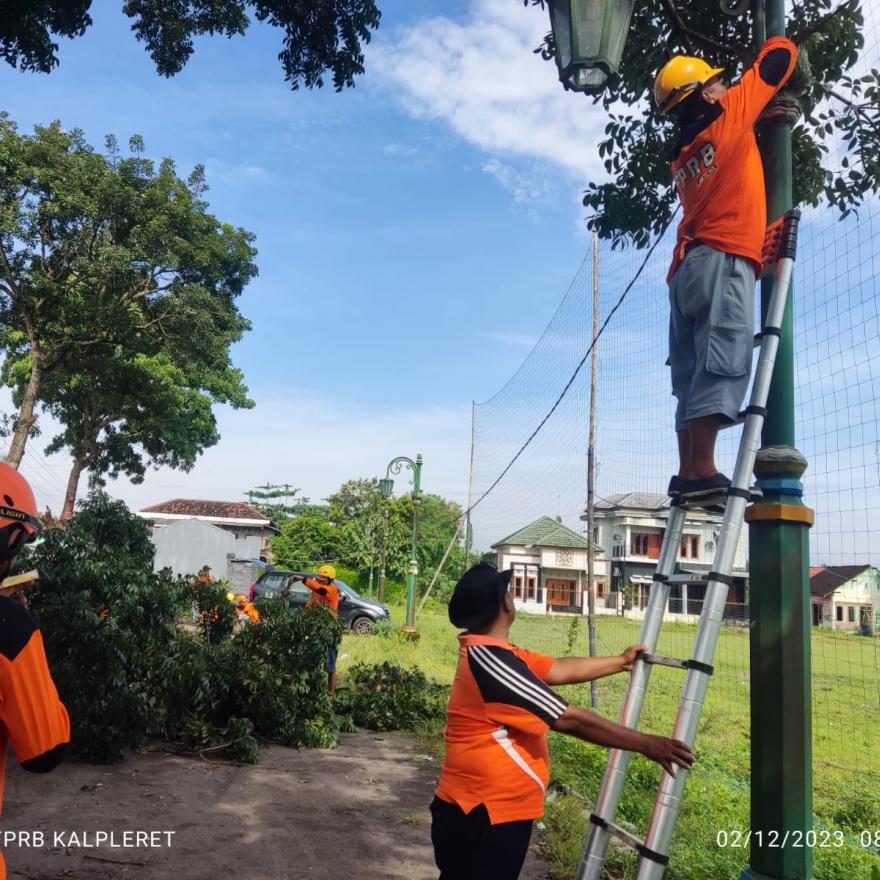 InfoPleret - Minggu 12 Januari 2023 pukul 08:00 WIB. Forum Pengurangan Resiko Bencana (FPRB) Kalurahan Pleret melaksanakan giat rabas-rabas ranting dan dahan pohon yang membahayakan masyarakat umum di sekitar lapangan Kanggotan.