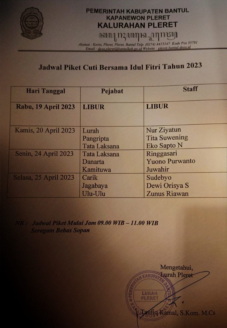 Jadwal Pelayanan Kalurahan Pleret Selama Libur Cuti Bersama dan HR. Idul Fitri 1444 H