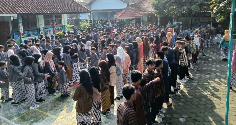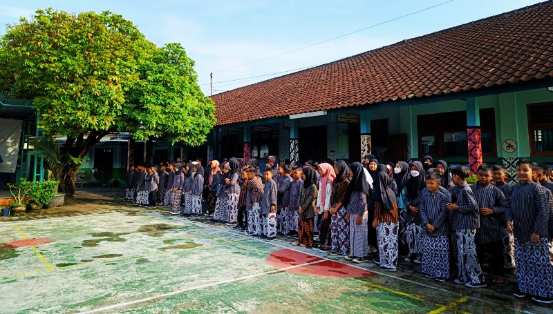 Info Pleret - Suasana pagi ini tampak berbeda di SD N Putren pada Selasa, 02 Mei 2023. Perbedaan tersebut tampak pada pakaian yang dikenakan oleh seluruh warga lingkungan sekolah. Alih-alih memakai seragam pramuka seperti hari selasa biasanya, para siswa, guru, karyawan, dan kepala sekolah mengenakan pakaian adat Ngayogyakarta, yang putri berkebaya lurik dan yang putra memakai sorjan.