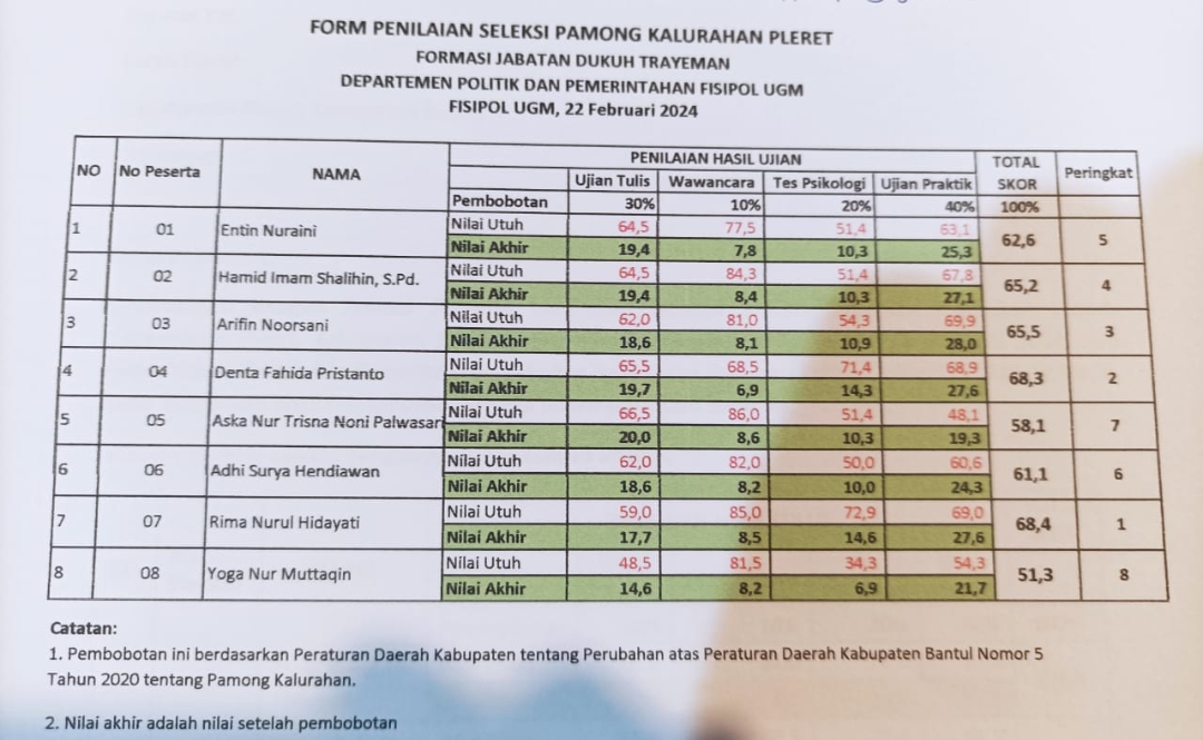 InfoPleret - Pada Kamis, 22 Februari 2024, Rima Nurul Hidayati menorehkan prestasi gemilang dengan meraih nilai tertinggi dalam ujian seleksi calon Dukuh Trayeman. Ujian ini diselenggarakan oleh Panitia Pengisian Lowongan Pamong Kalurahan Pleret, yang menetapkan hasil nilai ujian formasi Dukuh Trayeman setelah sehari penuh mengawal proses seleksi di Fakultas Ilmu Sosial dan Ilmu Politik Universitas Gadjah Mada, Yogyakarta.