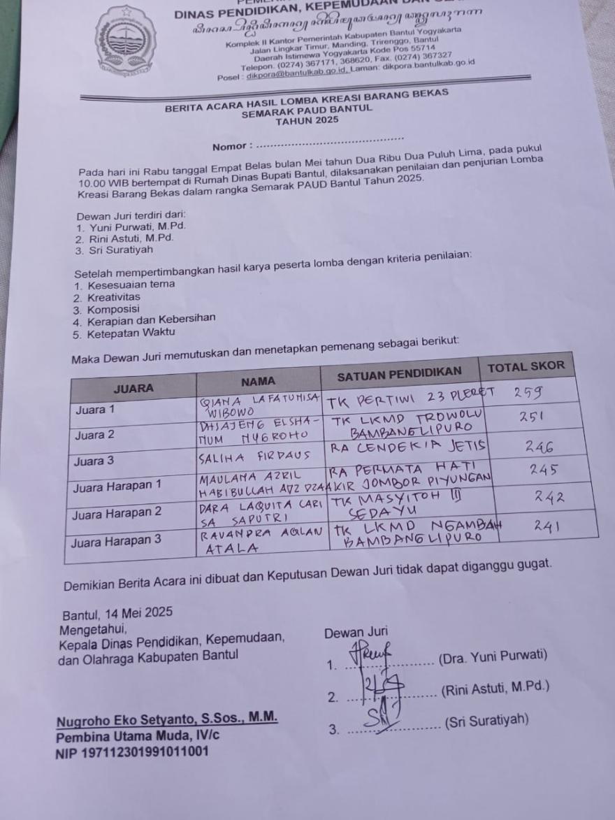 Lomba Kreasi Barang Bekas ini menjadi bukti bahwa anak-anak PAUD di Kabupaten Bantul memiliki potensi besar dalam berinovasi dengan memanfaatkan bahan daur ulang. TK Pertiwi 23 Pleret, melalui tangan kreatif Qiana, menunjukkan bahwa barang bekas bisa disulap menjadi karya bernilai tinggi sekaligus mengajarkan pentingnya menjaga lingkungan.