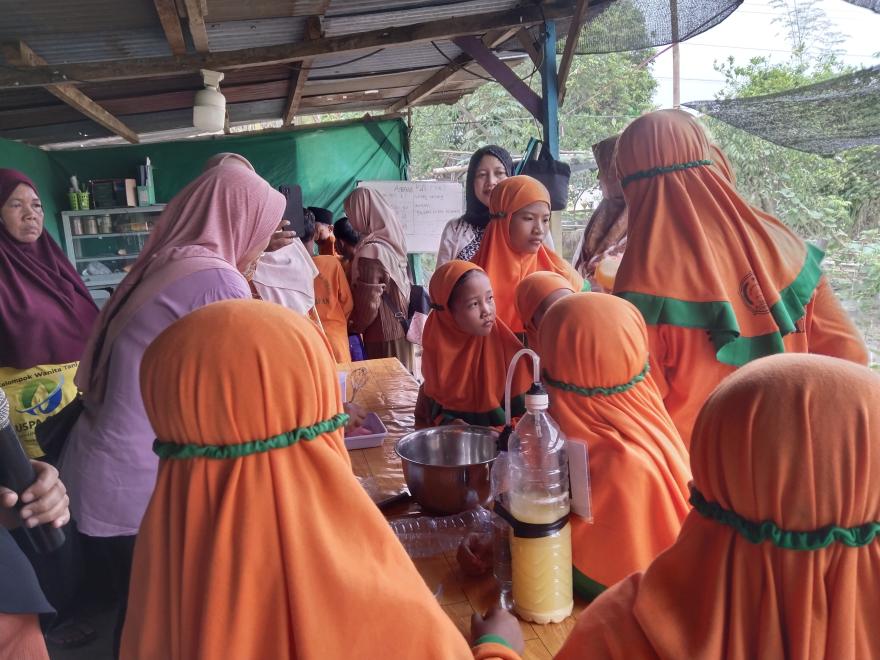 Anak-anak belajar langsung cara membuat pupuk hormon alami di KWT Puspa Gemari. Kegiatan dimulai dengan pengenalan tanaman, bahan dan alat pembuatan pupuk, lalu dilanjutkan dengan praktek membuat pupuk dan menyemprotkan pupuk ke tanaman sayuran.