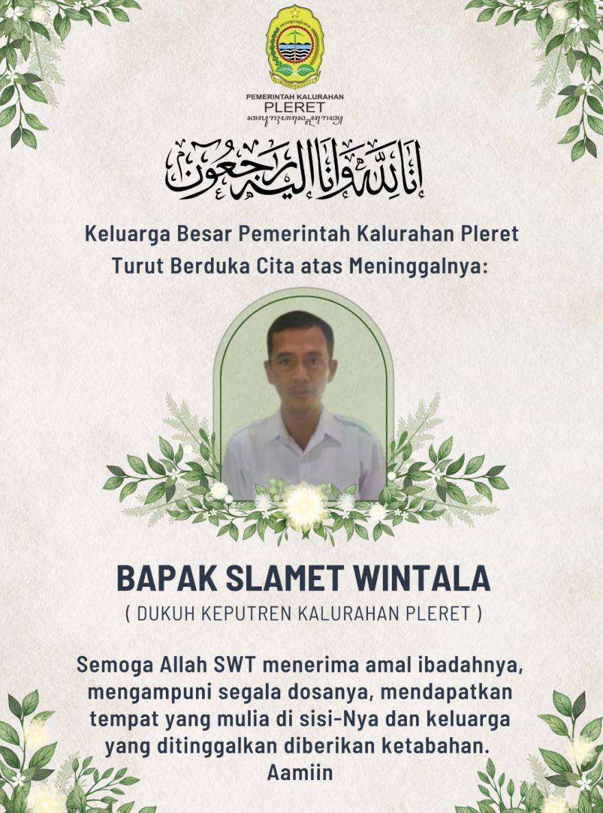 Yogyakarta, 4 Juli 2025 – Warga Dukuh Keputren, Pleret, berduka atas berpulangnya Alm. Slamet Wintala, Dukuh Keputren, pada usia 52 tahun. Beliau meninggal saat perawatan karena sakit di RSUD Kota Yogyakarta setelah mengabdi sebagai dukuh selama 16 tahun sejak dilantik pada 11 Maret 2009. Almarhum meninggalkan seorang istri dan seorang anak perempuan.