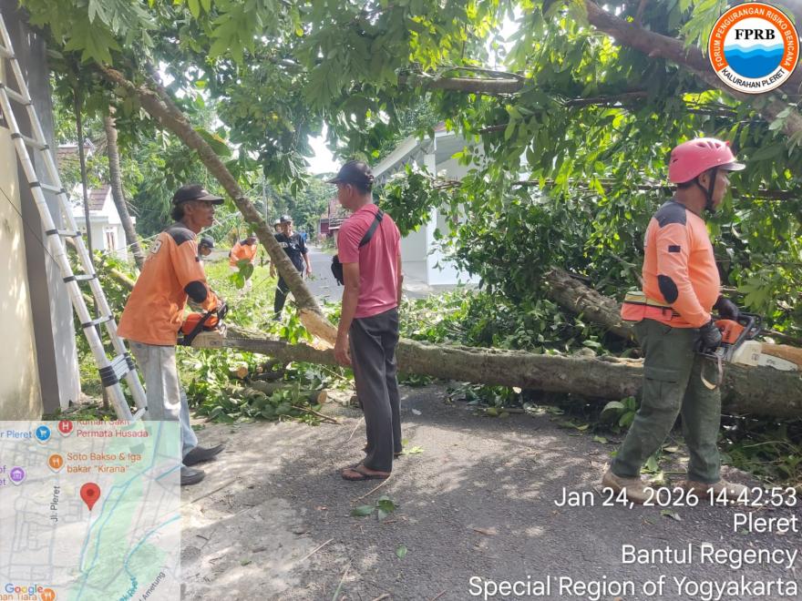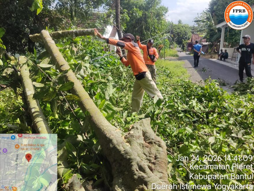 InfoPleret — Angin kencang yang melanda wilayah Kalurahan Pleret pada Sabtu, 24 Januari 2026, mengakibatkan beberapa pohon tumbang. Diantaranya di Padukuhan Pungkuran dan Kedaton. Peristiwa tersebut sempat mengganggu akses jalan dan berpotensi membahayakan keselamatan masyarakat sekitar.